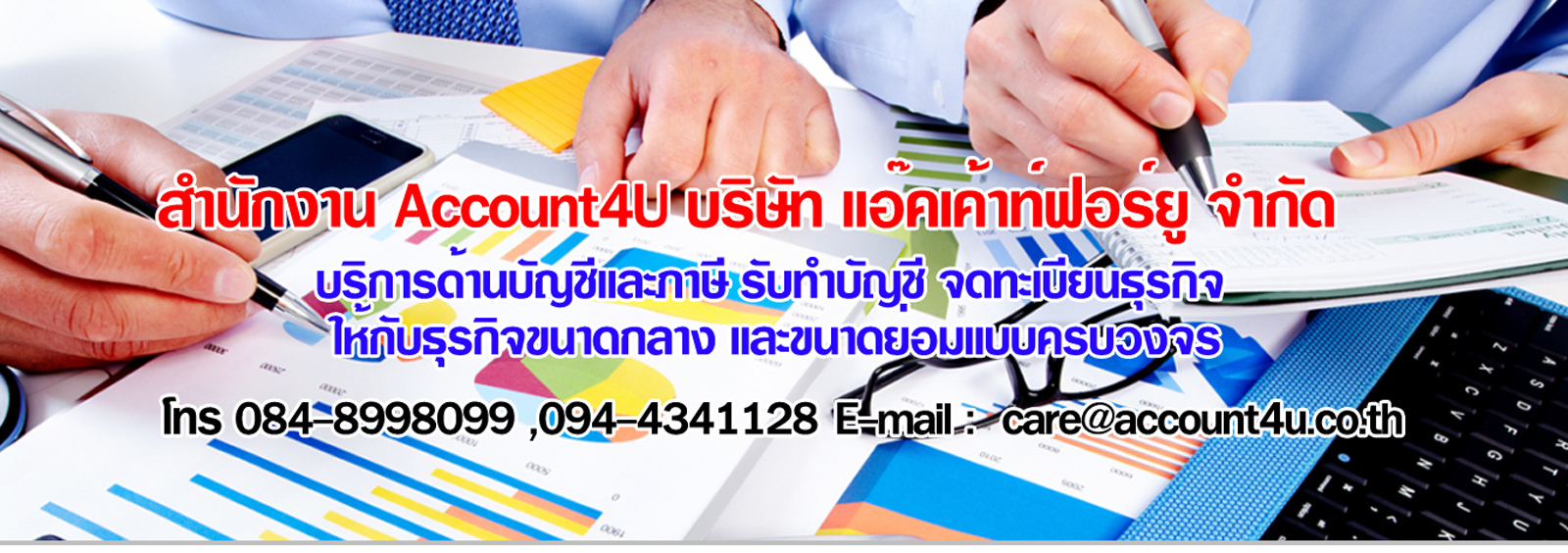 ให้บริการข้อมูลที่ถูกต้อง ครบถ้วน ตามมาตรฐานการบัญชีที่รับรองทั่วไป เพื่อให้เกิดประโยชน์สูงสุดกับลูกค้า...Account4U ช่วยให้คุณหมดกังวลเรื่องบัญชี มีการวางแผนภาษีอย่างรัดกุม และดำเนินงานอย่างเป็นระบบ เพื่อการเติบโตทางธุรกิจอย่างมั่นคง